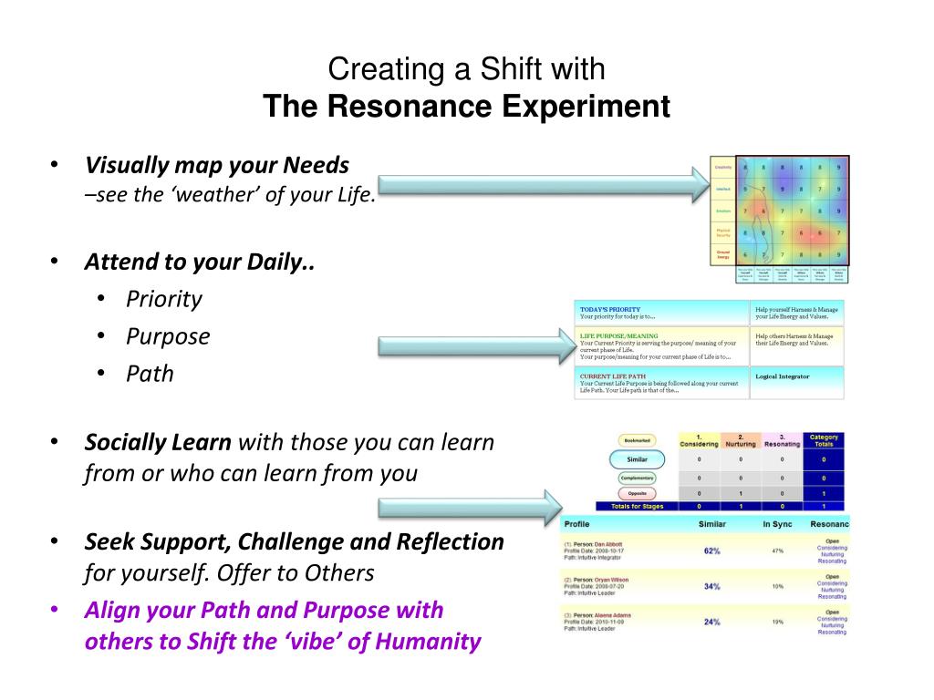 Creating a Shift with The Resonance Experiment • Visually map your Needs–see the ‘weather’ of your Life. • Attend to your Daily.. • Priority • Purpose • Path • Socially Learn with those you can learn from or who can learn from you • Seek Support, Challenge and Reflection for yourself. Offer to Others • Align your Path and Purpose with others to Shift the ‘vibe’ of Humanity