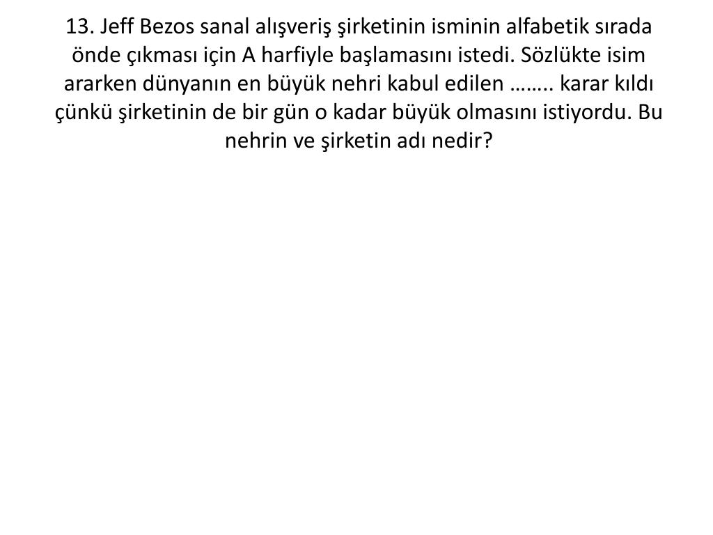 13.Jeff Bezos sanal alışveriş şirketinin isminin alfabetik sırada önde çıkması için A harfiyle başlamasını istedi. Sözlükte isim ararken dünyanın en büyük nehri kabul edilen …….. karar kıldı çünkü şirketinin de bir gün o kadar büyük olmasını istiyordu. Bu nehrin ve şirketin adı nedir? • Amazon