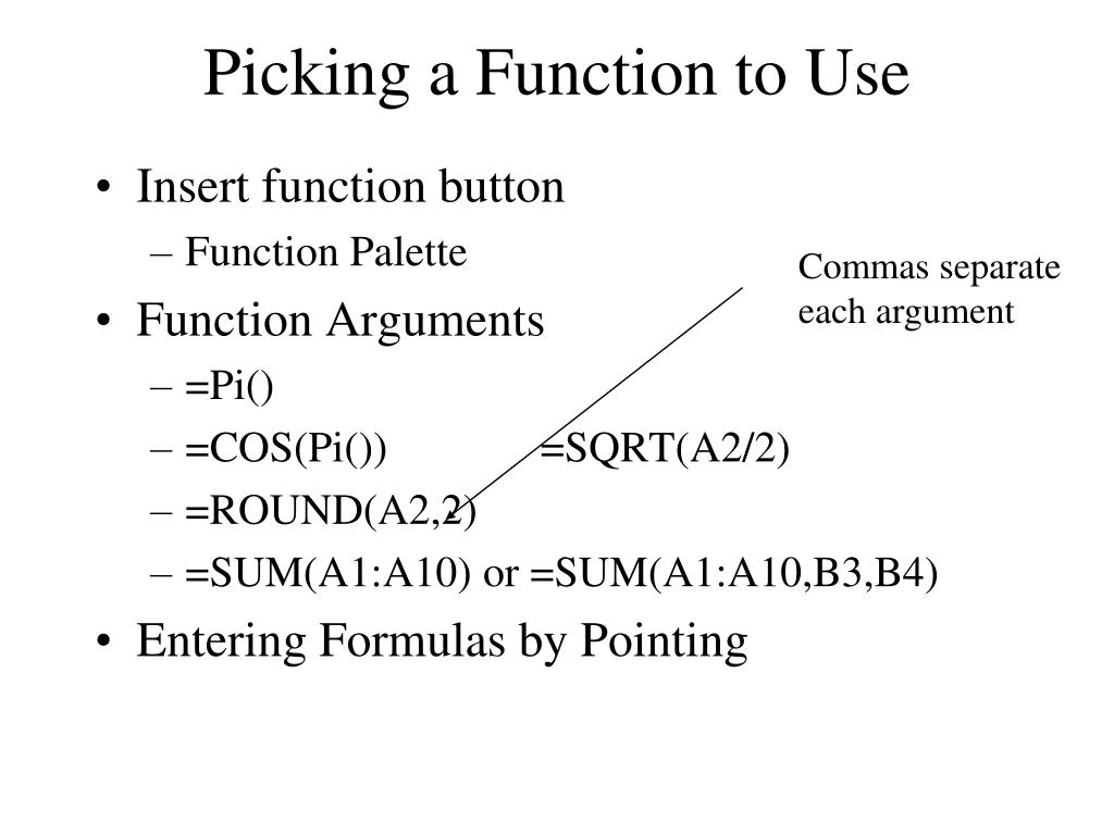 Picking a Function to Use Commas separate each argument • Insert function button • Function Palette • Function Arguments • =Pi() • =COS(Pi()) =SQRT(A2/2) • =ROUND(A2,2) • =SUM(A1:A10) or =SUM(A1:A10,B3,B4) • Entering Formulas by Pointing