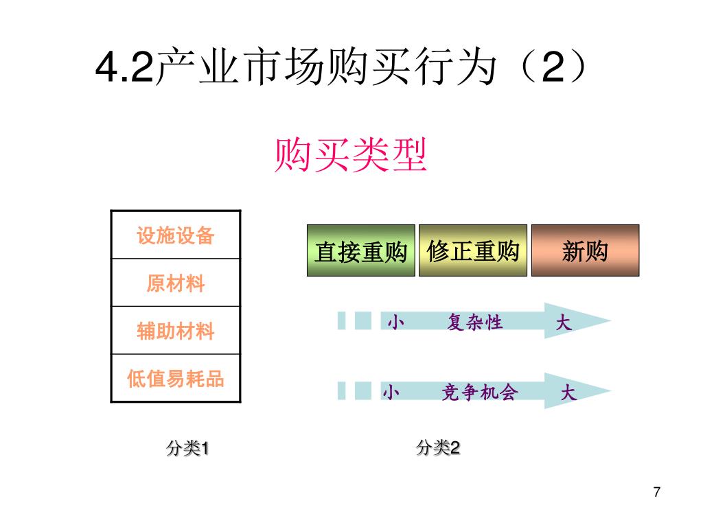 直接重购 修正重购 新购 分类2 4.2产业市场购买行为(2) 购买类型 小 复杂性 大 小 竞争机会 大 分类1