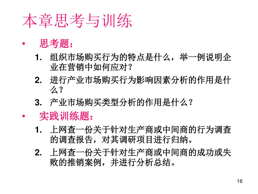本章思考与训练 • 思考题: • 组织市场购买行为的特点是什么,举一例说明企业在营销中如何应对? • 进行产业市场购买行为影响因素分析的作用是什么? • 产业市场购买类型分析的作用是什么? • 实践训练题: • 上网查一份关于针对生产商或中间商的行为调查的调查报告,对其调研项目进行归纳。 • 上网查一份关于针对生产商或中间商的成功或失败的推销案例,并进行分析总结。