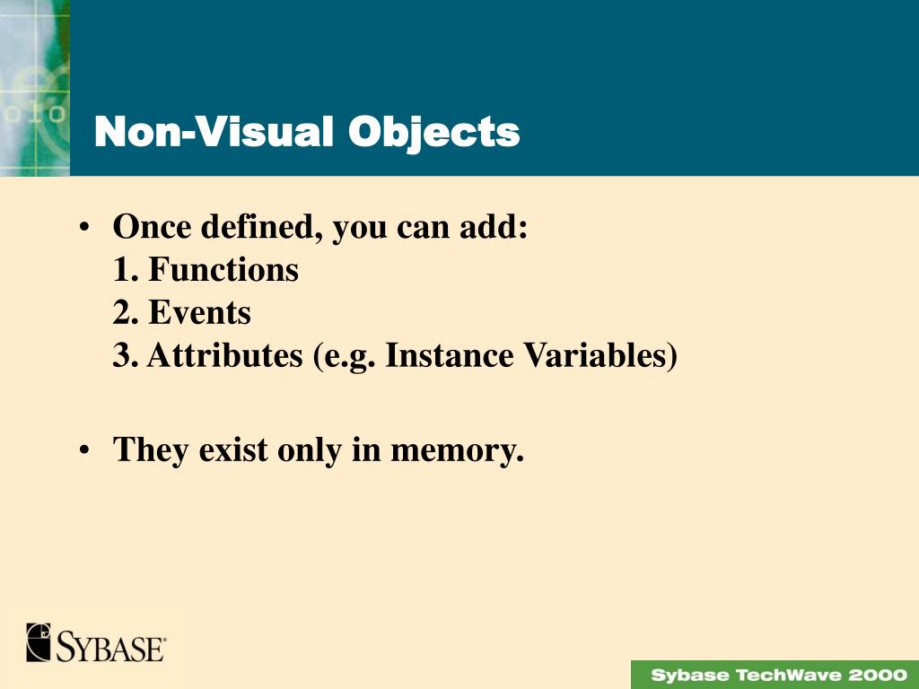 Once defined, you can add:1. Functions2. Events3. Attributes (e.g. Instance Variables) They exist only in memory. Non-Visual Objects