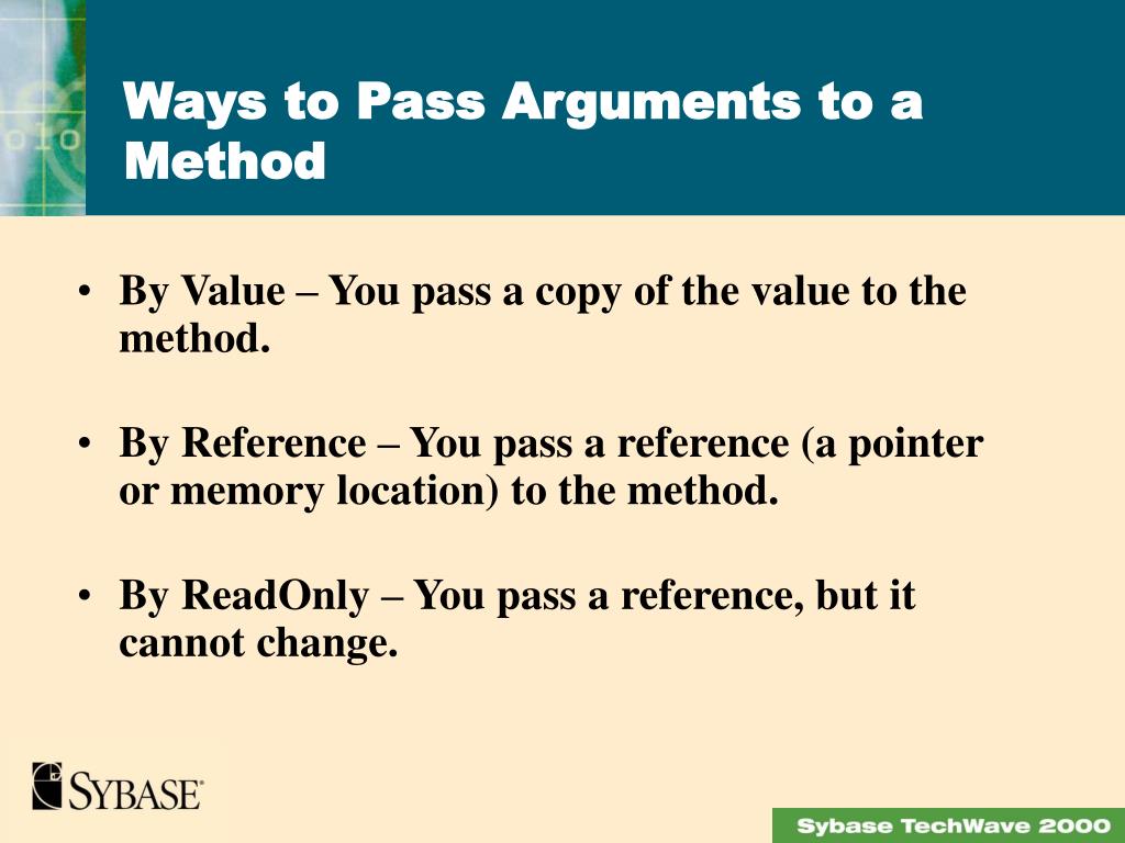 By Value – You pass a copy of the value to the method. By Reference – You pass a reference (a pointer or memory location) to the method. By ReadOnly – You pass a reference, but it cannot change. Ways to Pass Arguments to a Method