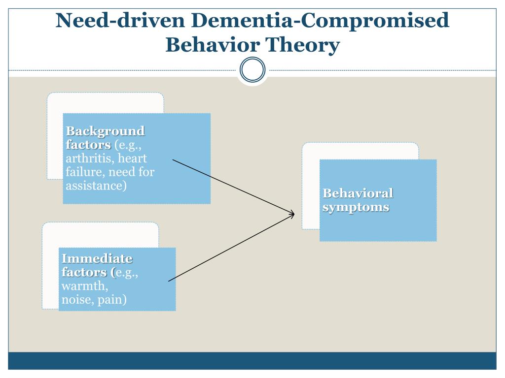 Need-driven Dementia-Compromised Behavior Theory Background factors (e.g., arthritis, heart failure, need for assistance) Behavioral symptoms Immediate factors (e.g., warmth, noise, pain)