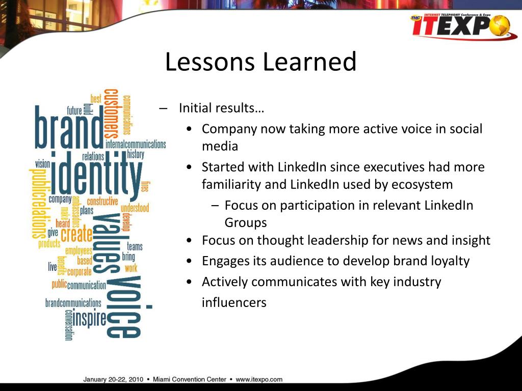 Lessons Learned • Initial results… • Company now taking more active voice in social media • Started with LinkedIn since executives had more familiarity and LinkedIn used by ecosystem • Focus on participation in relevant LinkedIn Groups • Focus on thought leadership for news and insight • Engages its audience to develop brand loyalty • Actively communicates with key industry • influencers