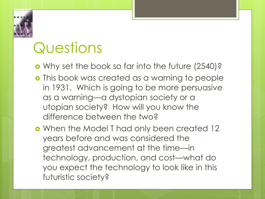 Questions • Why set the book so far into the future (2540)? • This book was created as a warning to people in 1931. Which is going to be more persuasive as a warning—a dystopian society or a utopian society? How will you know the difference between the two? • When the Model T had only been created 12 years before and was considered the greatest advancement at the time—in technology, production, and cost—what do you expect the technology to look like in this futuristic society?