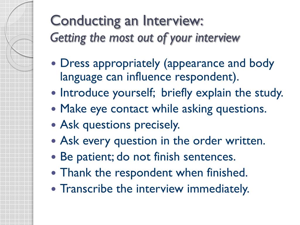 Conducting an Interview:Getting the most out of your interview • Dress appropriately (appearance and body language can influence respondent). • Introduce yourself; briefly explain the study. • Make eye contact while asking questions. • Ask questions precisely. • Ask every question in the order written. • Be patient; do not finish sentences. • Thank the respondent when finished. • Transcribe the interview immediately.