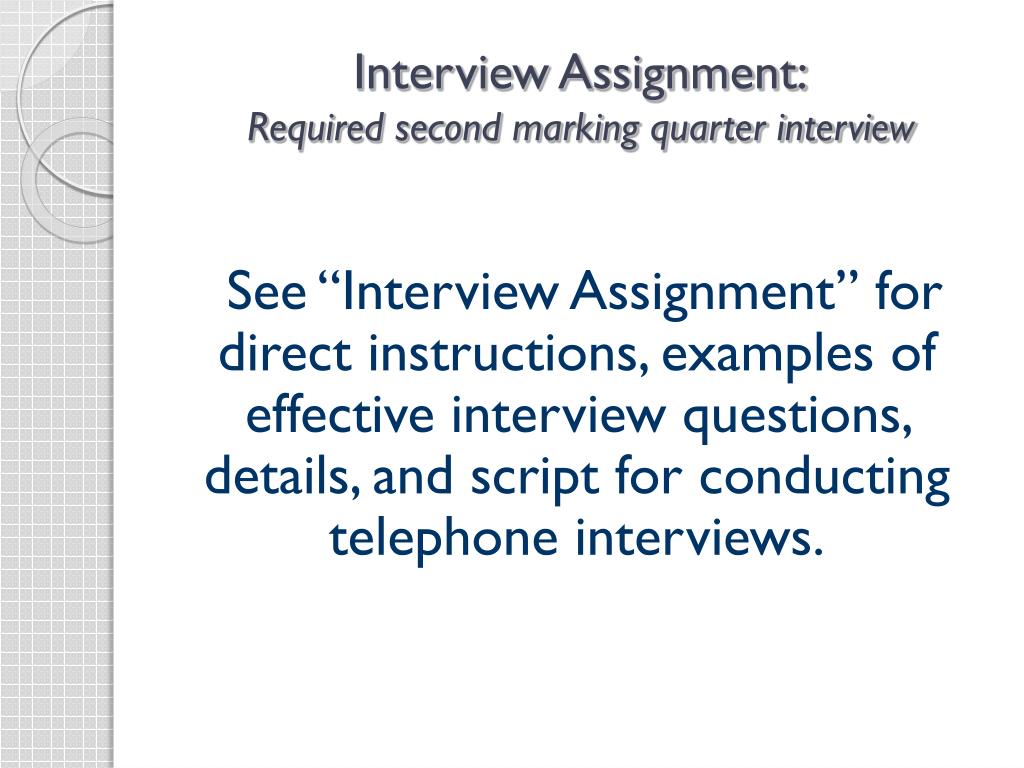 Interview Assignment:Required second marking quarter interview See “Interview Assignment” for direct instructions, examples of effective interview questions, details, and script for conducting telephone interviews.