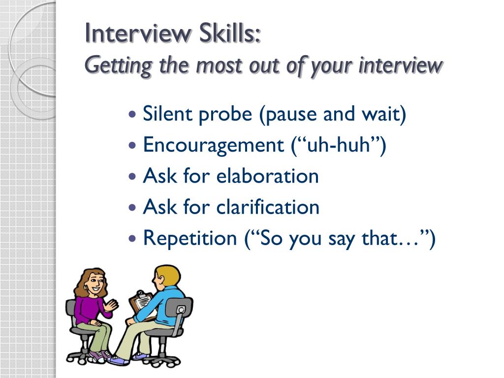 Interview Skills: Getting the most out of your interview • Silent probe (pause and wait) • Encouragement (“uh-huh”) • Ask for elaboration • Ask for clarification • Repetition (“So you say that…”)