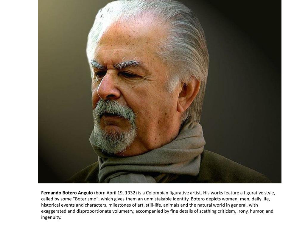 1. Fernando BoteroAngulo (born April 19, 1932) is a Colombian figurative artist. His works feature a figurative style, called by some "Boterismo", which gives them an unmistakable identity. Botero depicts women, men, daily life, historical events and characters, milestones of art, still-life, animals and the natural world in general, with exaggerated and disproportionate volumetry, accompanied by fine details of scathing criticism, irony, humor, and ingenuity.