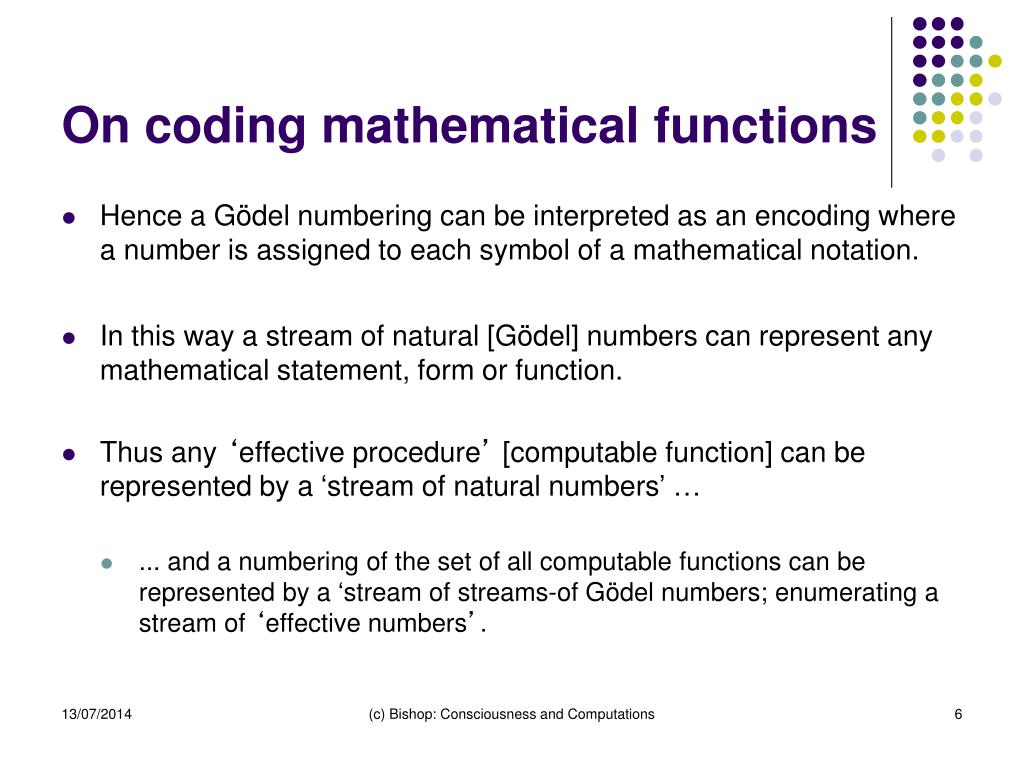 On coding mathematical functions • Hence a Gödel numbering can be interpreted as an encoding where a number is assigned to each symbol of a mathematical notation. • In this way a stream of natural [Gödel] numbers can represent any mathematical statement, form or function. • Thus any ‘effective procedure’ [computable function] can be represented by a ‘stream of natural numbers’ … • ... and a numbering of the set of all computable functions can be represented by a ‘stream of streams-of Gödel numbers; enumerating a stream of ‘effective numbers’. (c) Bishop: Consciousness and Computations