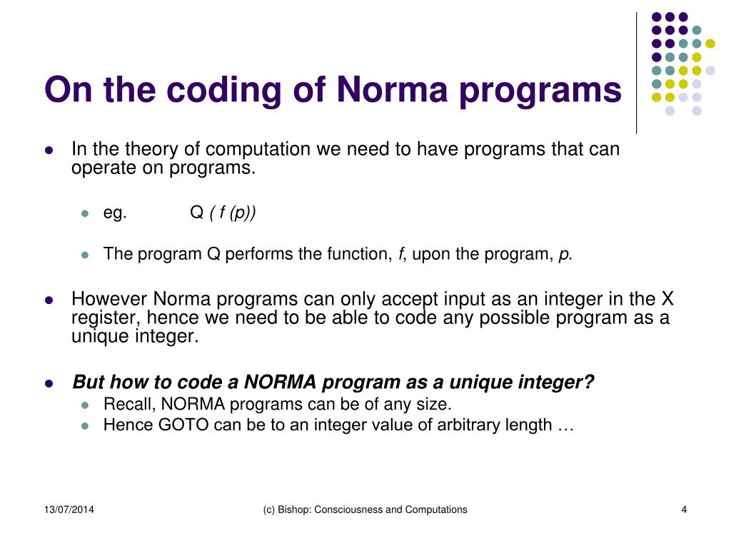 On the coding of Norma programs • In the theory of computation we need to have programs that can operate on programs. • eg. Q ( f (p)) • The program Q performs the function, f, upon the program, p. • However Norma programs can only accept input as an integer in the X register, hence we need to be able to code any possible program as a unique integer. • But how to code a NORMA program as a unique integer? • Recall, NORMA programs can be of any size. • Hence GOTO can be to an integer value of arbitrary length … (c) Bishop: Consciousness and Computations