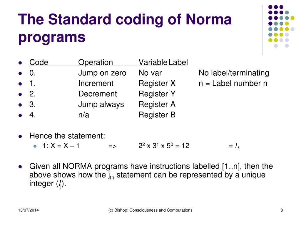 The Standard coding of Norma programs • Code Operation Variable Label • 0. Jump on zero No var No label/terminating • 1. Increment Register X n = Label number n • 2. Decrement Register Y • 3. Jump always Register A • 4. n/a Register B • Hence the statement: • 1: X = X – 1 => 22 x 31 x 50 = 12 = l1 • Given all NORMA programs have instructions labelled [1..n], then the above shows how the jth statement can be represented by a unique integer (lj). (c) Bishop: Consciousness and Computations