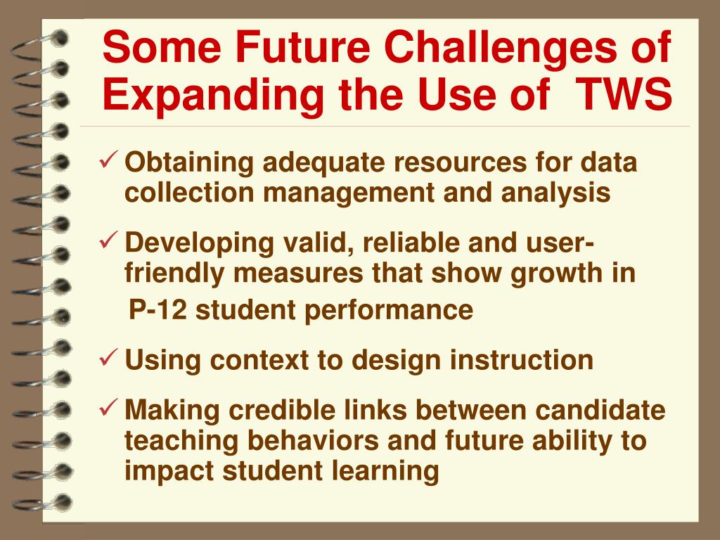 Some Future Challenges of Expanding the Use of TWS • Obtaining adequate resources for data collection management and analysis • Developing valid, reliable and user-friendly measures that show growth in P-12 student performance • Using context to design instruction • Making credible links between candidate teaching behaviors and future ability to impact student learning
