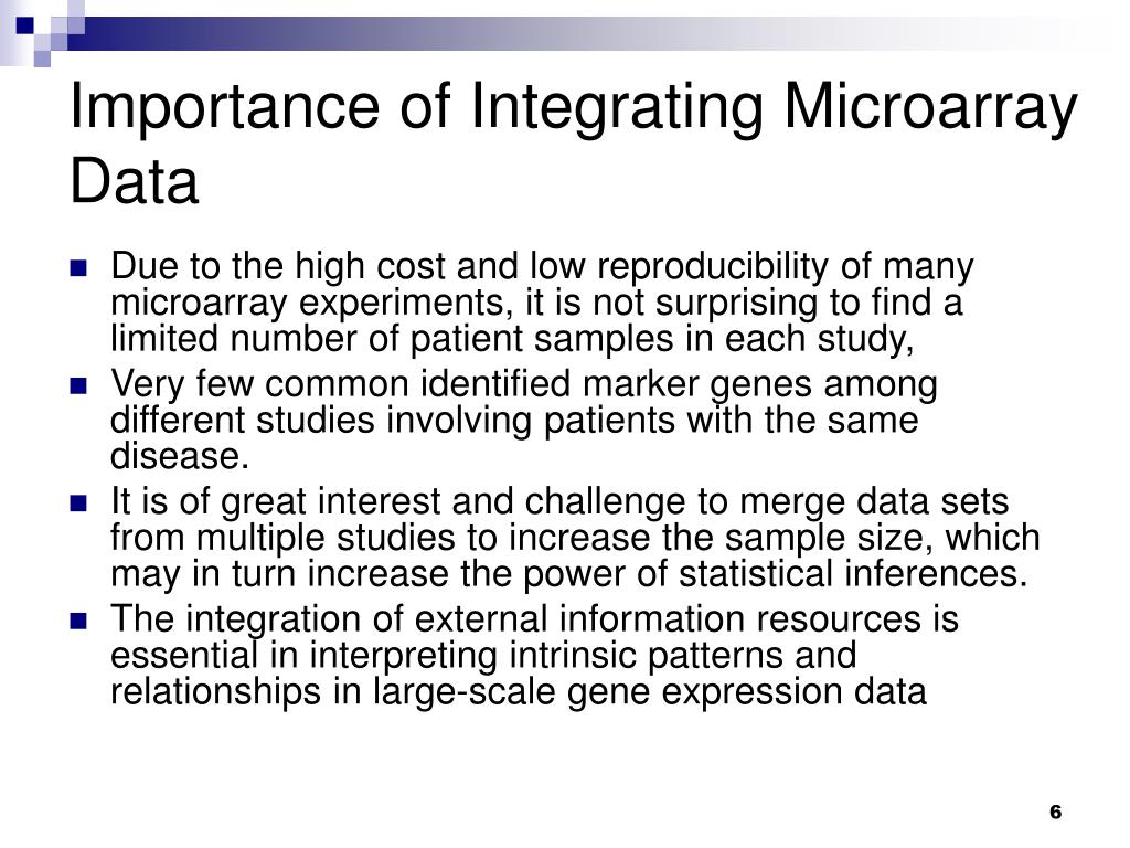 Importance of Integrating Microarray Data • Due to the high cost and low reproducibility of many microarray experiments, it is not surprising to find a limited number of patient samples in each study, • Very few common identified marker genes among different studies involving patients with the same disease. • It is of great interest and challenge to merge data sets from multiple studies to increase the sample size, which may in turn increase the power of statistical inferences. • The integration of external information resources is essential in interpreting intrinsic patterns and relationships in large-scale gene expression data