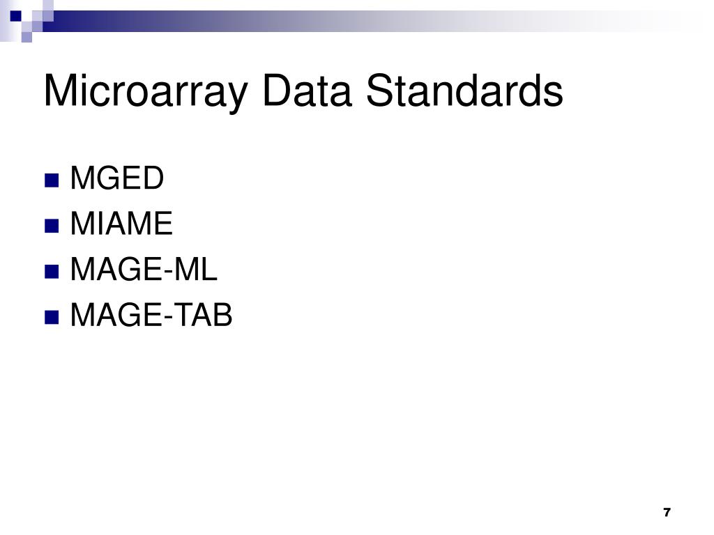 Microarray Data Standards • MGED • MIAME • MAGE-ML • MAGE-TAB