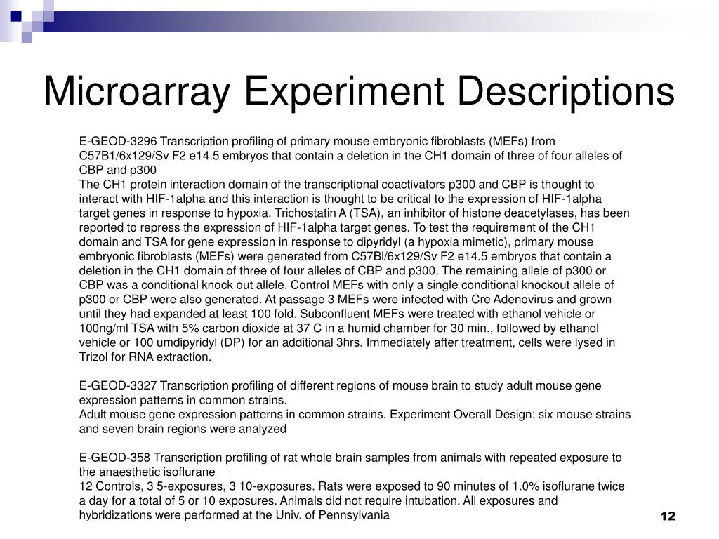 Microarray Experiment Descriptions E-GEOD-3296 Transcription profiling of primary mouse embryonic fibroblasts (MEFs) from C57B1/6x129/Sv F2 e14.5 embryos that contain a deletion in the CH1 domain of three of four alleles of CBP and p300 The CH1 protein interaction domain of the transcriptional coactivators p300 and CBP is thought to interact with HIF-1alpha and this interaction is thought to be critical to the expression of HIF-1alpha target genes in response to hypoxia. Trichostatin A (TSA), an inhibitor of histone deacetylases, has been reported to repress the expression of HIF-1alpha target genes. To test the requirement of the CH1 domain and TSA for gene expression in response to dipyridyl (a hypoxia mimetic), primary mouse embryonic fibroblasts (MEFs) were generated from C57Bl/6x129/Sv F2 e14.5 embryos that contain a deletion in the CH1 domain of three of four alleles of CBP and p300. The remaining allele of p300 or CBP was a conditional knock out allele. Control MEFs with only a single conditional knockout allele of p300 or CBP were also generated. At passage 3 MEFs were infected with Cre Adenovirus and grown until they had expanded at least 100 fold. Subconfluent MEFs were treated with ethanol vehicle or 100ng/ml TSA with 5% carbon dioxide at 37 C in a humid chamber for 30 min., followed by ethanol vehicle or 100 umdipyridyl (DP) for an additional 3hrs. Immediately after treatment, cells were lysed in Trizol for RNA extraction. E-GEOD-3327 Transcription profiling of different regions of mouse brain to study adult mouse gene expression patterns in common strains. Adult mouse gene expression patterns in common strains. Experiment Overall Design: six mouse strains and seven brain regions were analyzed E-GEOD-358 Transcription profiling of rat whole brain samples from animals with repeated exposure to the anaesthetic isoflurane 12 Controls, 3 5-exposures, 3 10-exposures. Rats were exposed to 90 minutes of 1.0% isoflurane twice a day for a total of 5 or 10 exposures. Animals did not require intubation. All exposures and hybridizations were performed at the Univ. of Pennsylvania