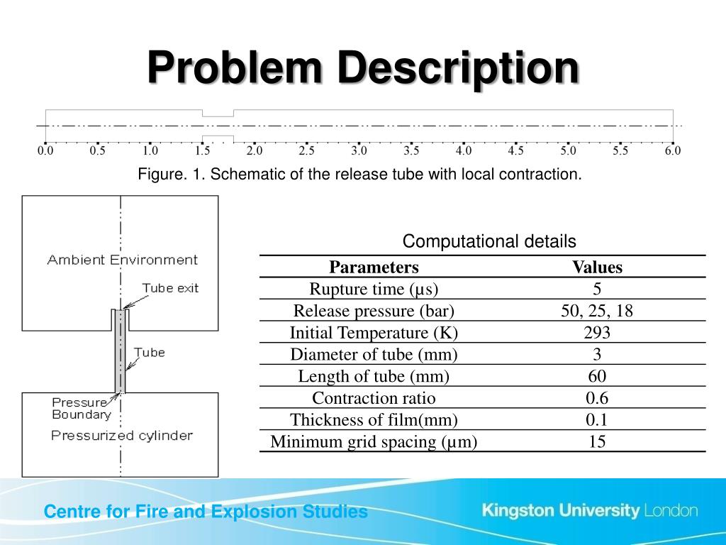 Background Experimental studies: Wolanski & Wojicicki (1973): direct release into confine chamber filled with oxygen. Dryer et al.(2007): release through tubes with different internal geometries into ambient air. Golub et al. (2008): release through tubes with different shapes of cross section into air. Mogi et al. (2008,2009): release through a straight tube into ambient air. Lee et al. (2011): release through a straight tube into ambient air. Numerical Studies: Liu et al. (2006): direct release into ambient air. Golub et al. (2007, 2008): direct release and release through a straight tube into ambient air. Lee et al. (2009): release inside a straight tube filled with ambient air. Yamada et al. (2009, 2011): release through a straight tube into ambient air. Xu & Wen (2008- 2011): direct release and release through a straight tube into ambient air. Objective: To study the effect of internal geometry on the propensity to spontaneous ignition using a release tube with a local contraction. local contraction