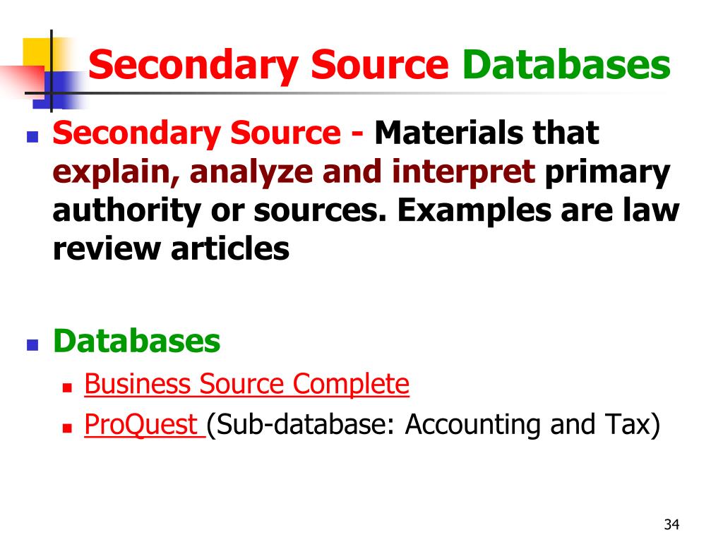 Secondary Source Databases • Secondary Source - Materials that explain, analyze and interpretprimary authority or sources. Examples are law review articles • Databases • Business Source Complete • ProQuest (Sub-database: Accounting and Tax)
