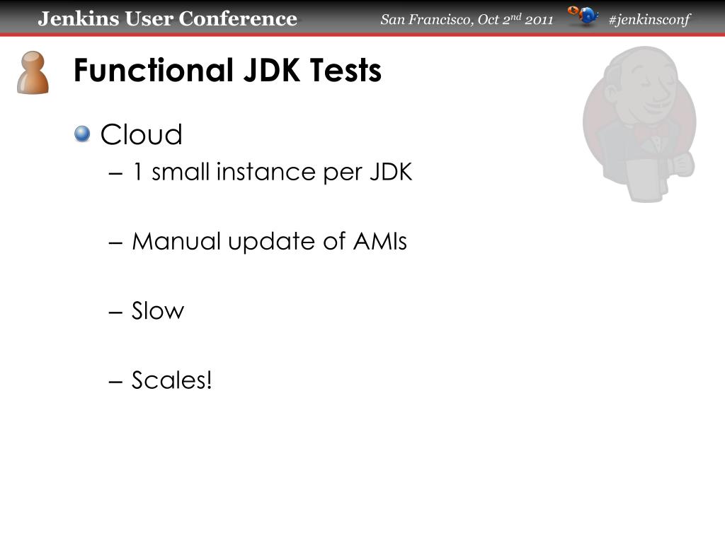 Functional JDK Tests • Cloud • 1 small instance per JDK • Manual update of AMIs • Slow • Scales!