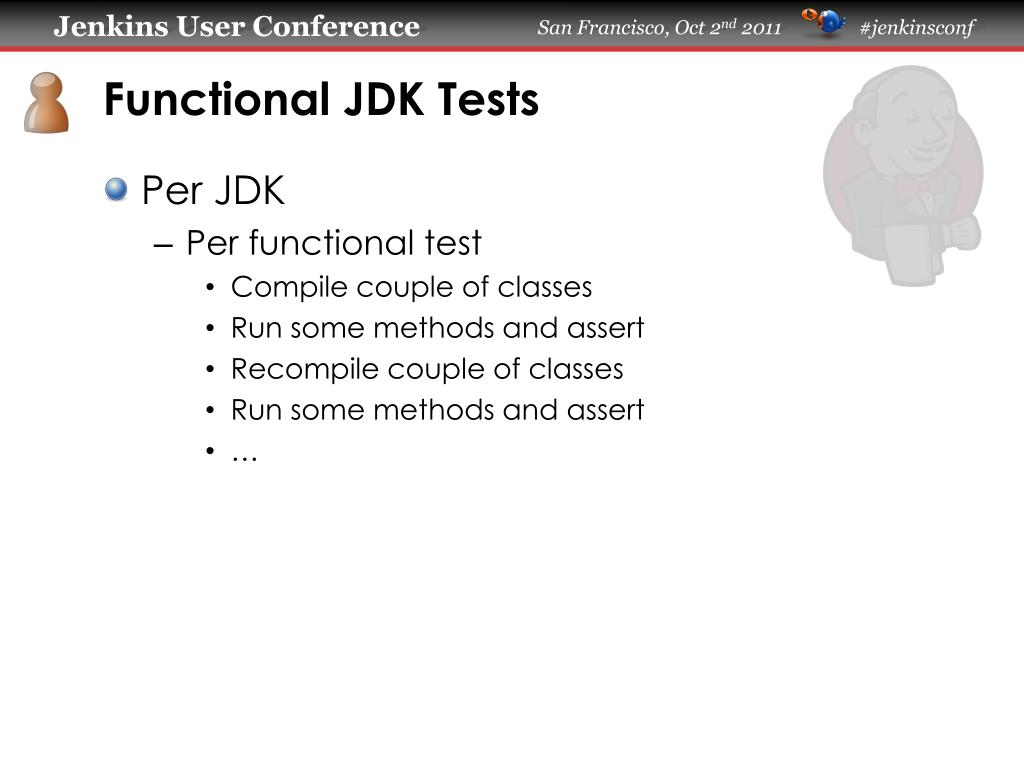 Functional JDK Tests • Per JDK • Per functional test • Compile couple of classes • Run some methods and assert • Recompile couple of classes • Run some methods and assert • …