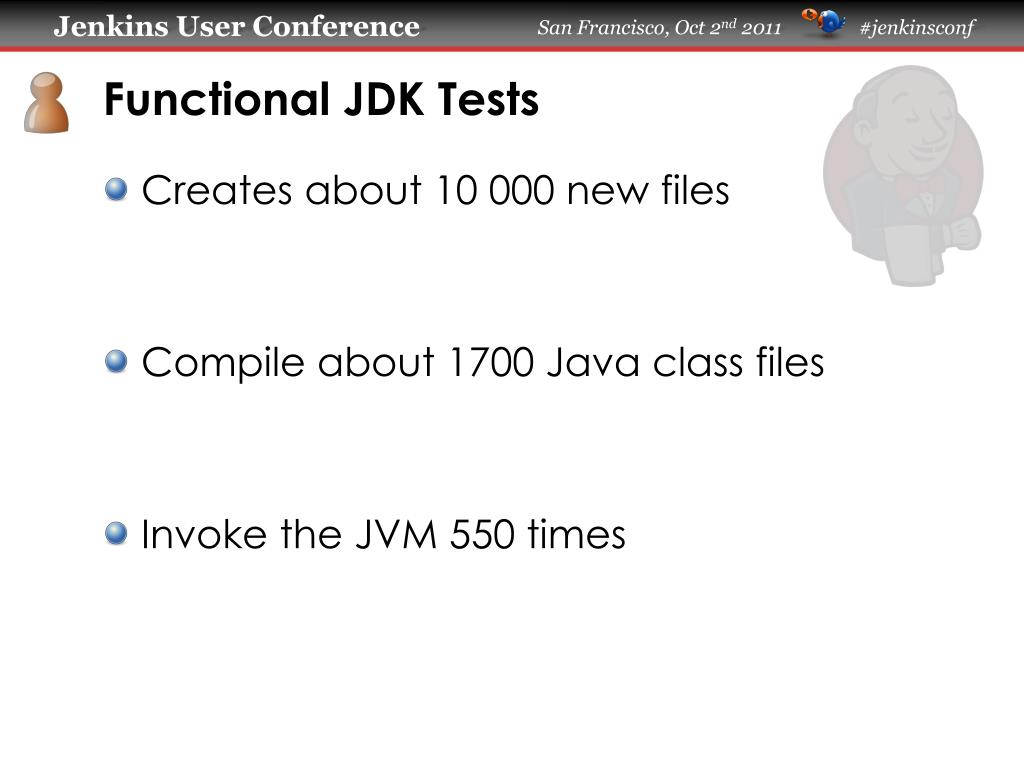 Functional JDK Tests • Creates about 10 000 new files • Compile about 1700 Java class files • Invoke the JVM 550 times