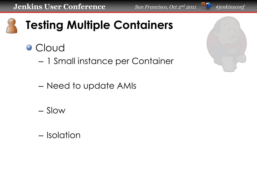 Testing Multiple Containers • Cloud • 1 Small instance per Container • Need to update AMIs • Slow • Isolation