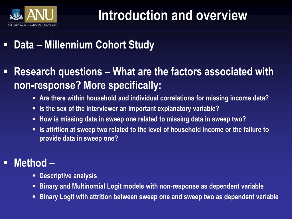 Introduction and overview • Data – Millennium Cohort Study • Research questions – What are the factors associated with non-response? More specifically: • Are there within household and individual correlations for missing income data? • Is the sex of the interviewer an important explanatory variable? • How is missing data in sweep one related to missing data in sweep two? • Is attrition at sweep two related to the level of household income or the failure to provide data in sweep one? • Method – • Descriptive analysis • Binary and Multinomial Logit models with non-response as dependent variable • Binary Logit with attrition between sweep one and sweep two as dependent variable