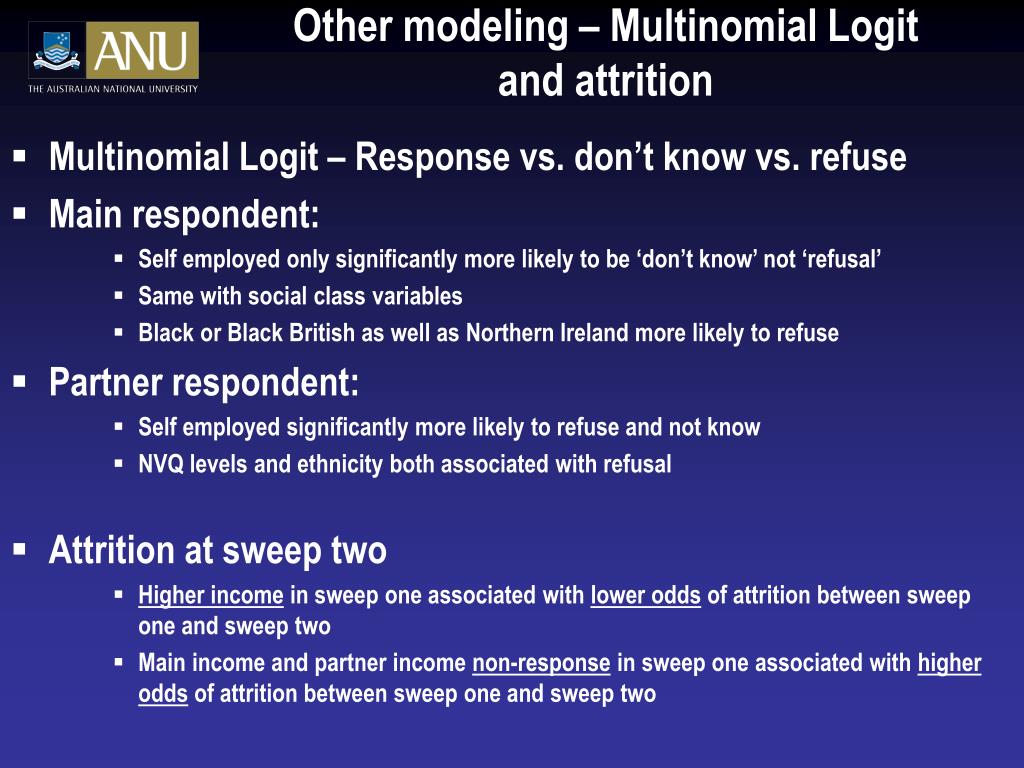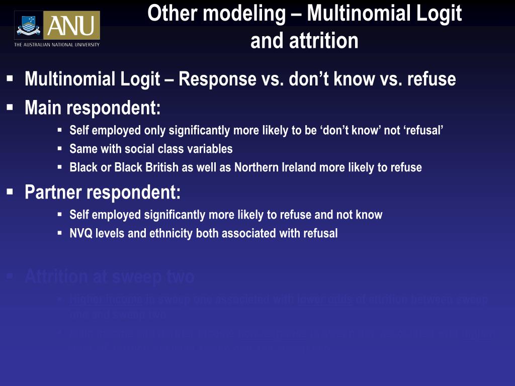 Other modeling – Multinomial Logit and attrition • Multinomial Logit – Response vs. don’t know vs. refuse • Main respondent: • Self employed only significantly more likely to be ‘don’t know’ not ‘refusal’ • Same with social class variables • Black or Black British as well as Northern Ireland more likely to refuse • Partner respondent: • Self employed significantly more likely to refuse and not know • NVQ levels and ethnicity both associated with refusal • Attrition at sweep two • Higher income in sweep one associated with lower odds of attrition between sweep one and sweep two • Main income and partner income non-response in sweep one associated with higher odds of attrition between sweep one and sweep two