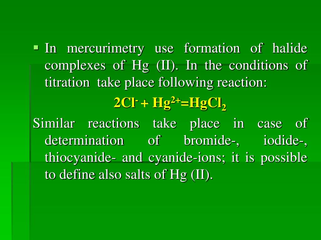 In mercurimetry use formation of halide complexes of Hg (II). In the conditions of titration take place following reaction: 2Cl- + Hg2+=HgCl2 Similar reactions take place in case of determination of bromide-, iodide-, thiocyanide- and cyanide-ions; it is possible to define also salts of Hg (II).