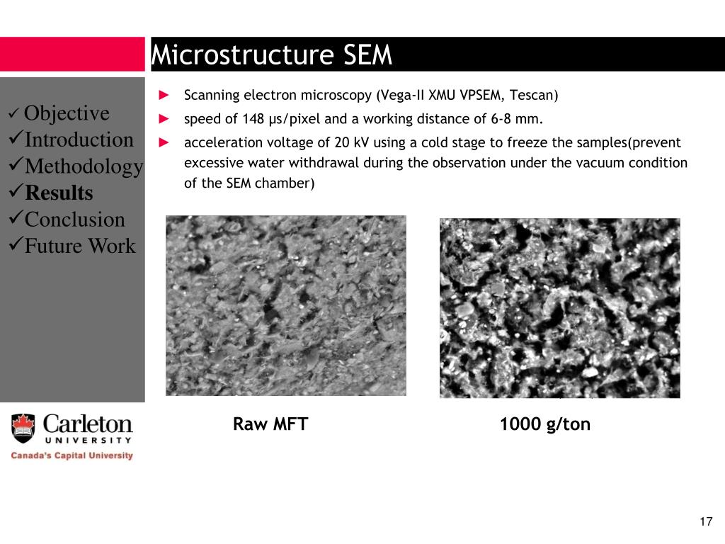 Microstructure SEM • Scanning electron microscopy (Vega-II XMU VPSEM, Tescan) • speed of 148 µs/pixel and a working distance of 6-8 mm. • acceleration voltage of 20 kV using a cold stage to freeze the samples(prevent excessive water withdrawal during the observation under the vacuum condition of the SEM chamber) Raw MFT 1000 g/ton • Objective • Introduction • Methodology • Results • Conclusion • Future Work