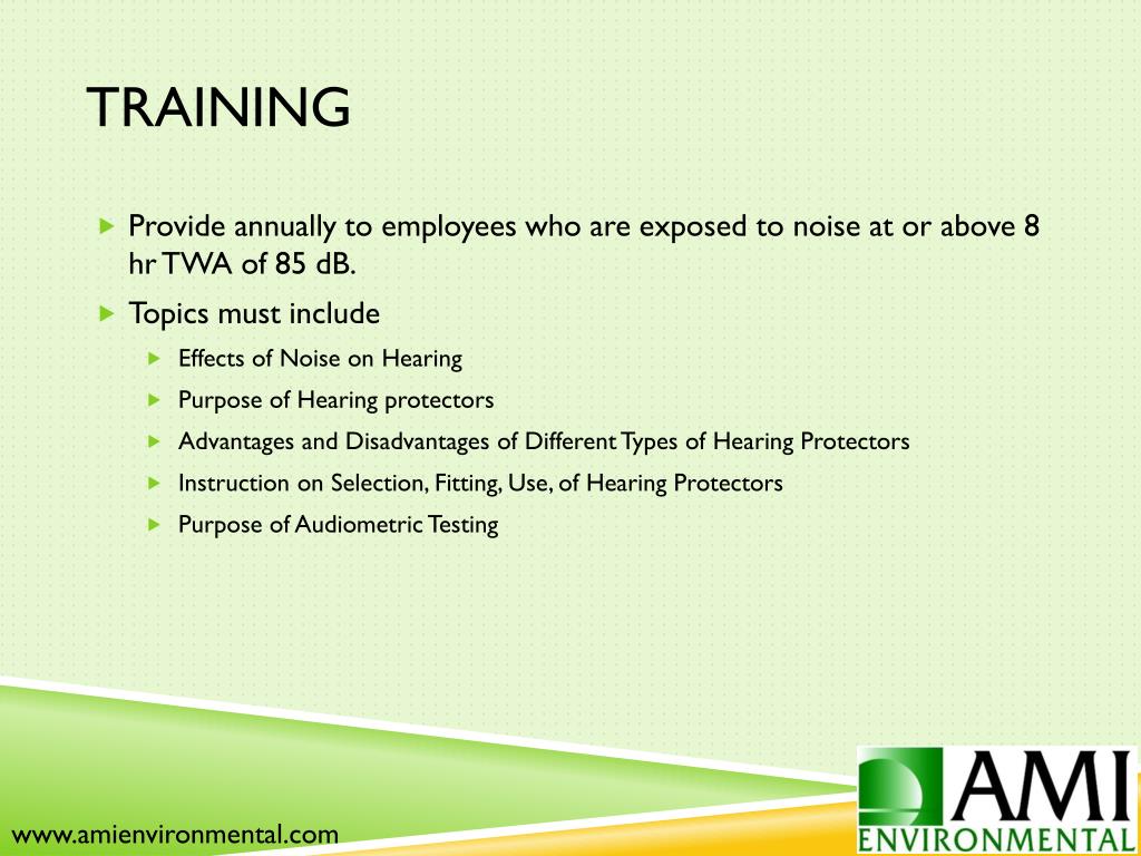 Training • Provide annually to employees who are exposed to noise at or above 8 hr TWA of 85 dB. • Topics must include • Effects of Noise on Hearing • Purpose of Hearing protectors • Advantages and Disadvantages of Different Types of Hearing Protectors • Instruction on Selection, Fitting, Use, of Hearing Protectors • Purpose of Audiometric Testing www.amienvironmental.com