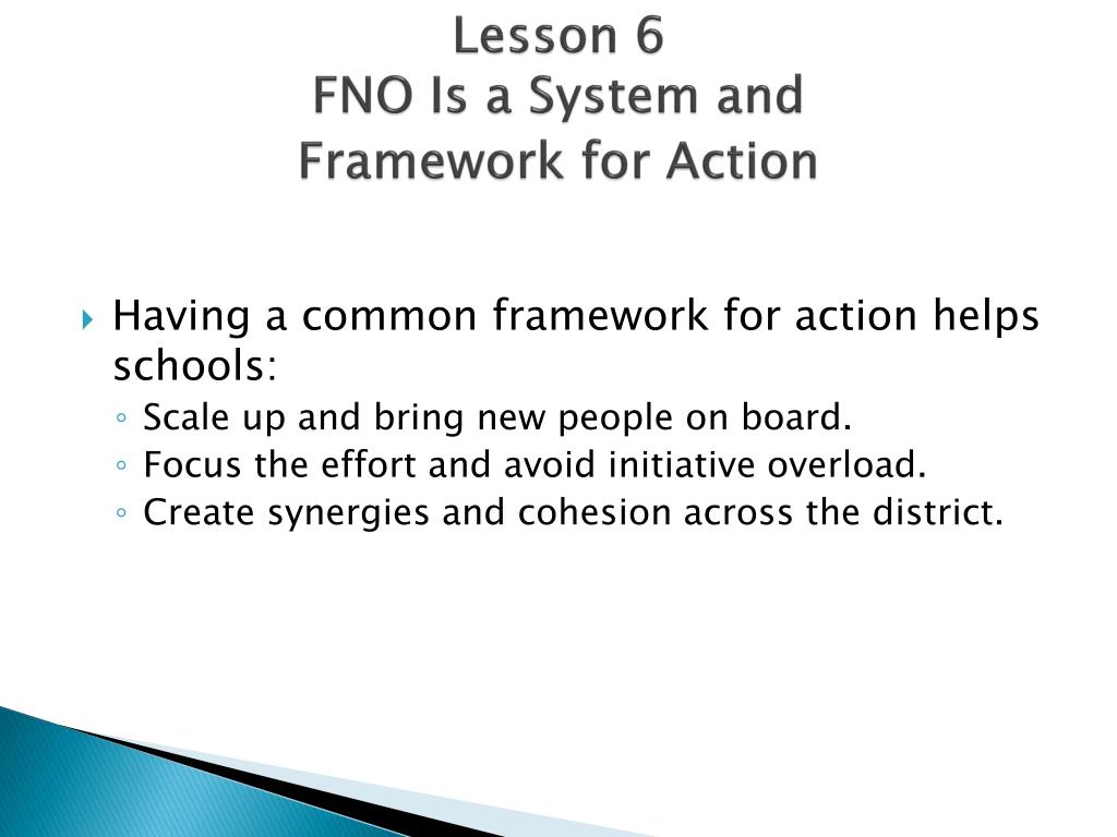 Lesson 6FNO Is a System and Framework for Action • Having a common framework for action helps schools: • Scale up and bring new people on board. • Focus the effort and avoid initiative overload. • Create synergies and cohesion across the district.