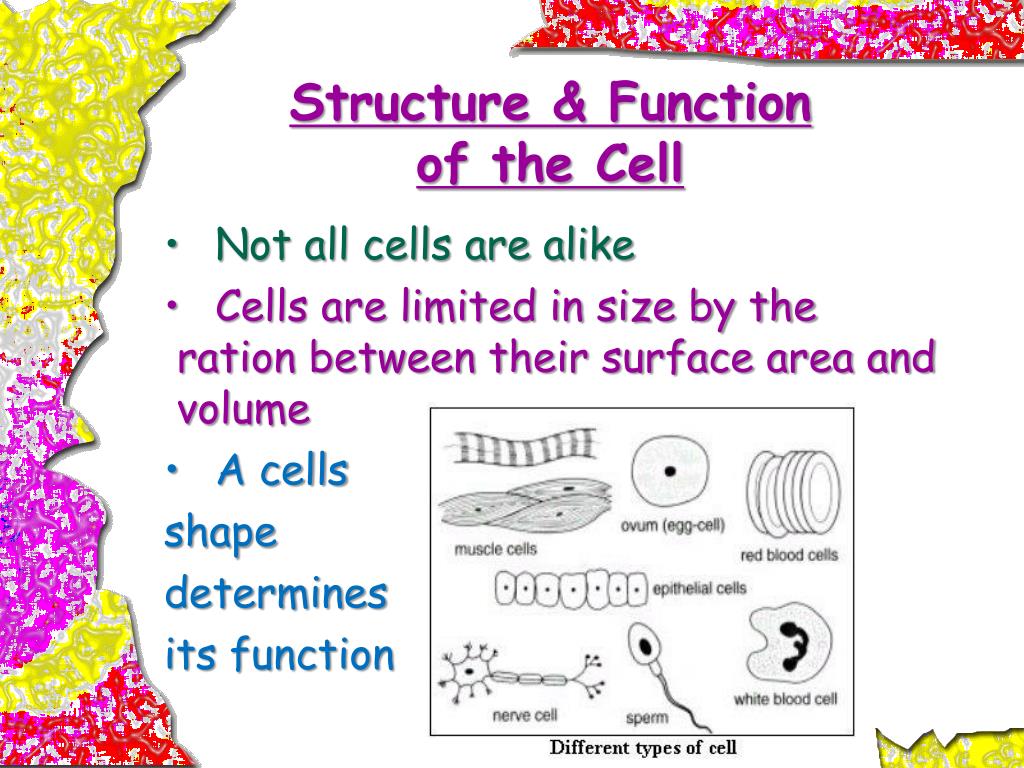Structure & Functionof the Cell • Not all cells are alike • Cells are limited in size by the ration between their surface area and volume • A cells shape determines its function