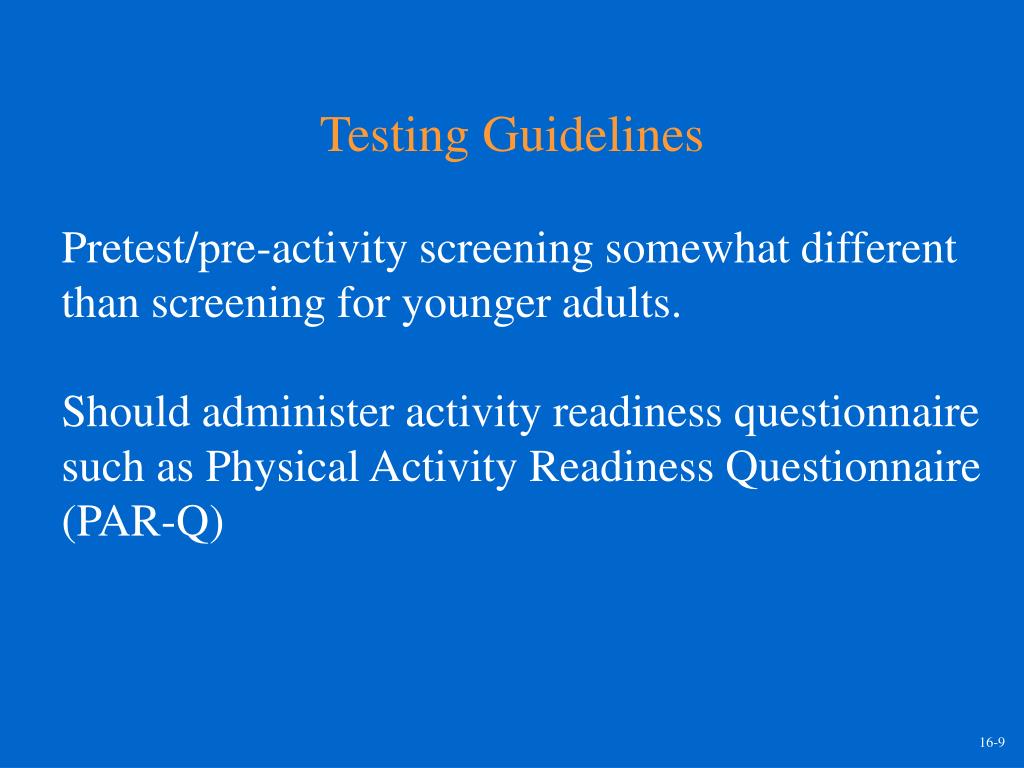 Testing Guidelines Pretest/pre-activity screening somewhat different than screening for younger adults. Should administer activity readiness questionnaire such as Physical Activity Readiness Questionnaire (PAR-Q) 16-9