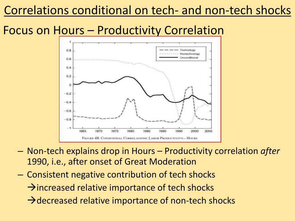 Correlations conditional on tech- and non-tech shocks Focus on Hours – Productivity Correlation • Non-tech explains drop in Hours – Productivity correlation after 1990, i.e., after onset of Great Moderation • Consistent negative contribution of tech shocks increased relative importance of tech shocks decreased relative importance of non-tech shocks