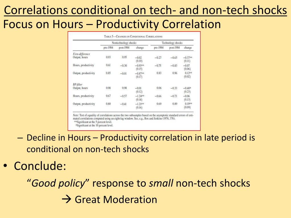 Correlations conditional on tech- and non-tech shocks Focus on Hours – Productivity Correlation • Decline in Hours – Productivity correlation in late period is conditional on non-tech shocks • Conclude: “Good policy” response to small non-tech shocks Great Moderation