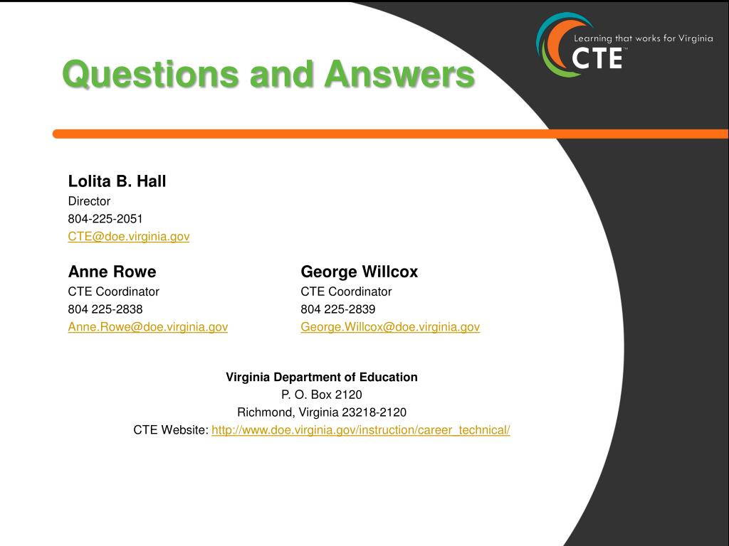 Questions and Answers Lolita B. Hall Director 804-225-2051 CTE@doe.virginia.gov Anne Rowe George Willcox CTE Coordinator CTE Coordinator 804 225-2838 804 225-2839 Anne.Rowe@doe.virginia.govGeorge.Willcox@doe.virginia.gov Virginia Department of Education P. O. Box 2120 Richmond, Virginia 23218-2120 CTE Website: http://www.doe.virginia.gov/instruction/career_technical/