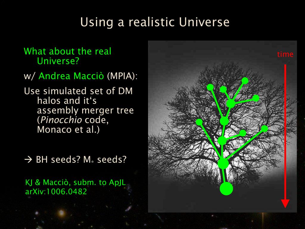 Using a realistic Universe What about the real Universe? w/ Andrea Macciò (MPIA): Use simulated set of DM halos and it‘s assembly merger tree (Pinocchio code, Monaco et al.) BH seeds? M* seeds? time KJ & Macciò, subm. to ApJL arXiv:1006.0482