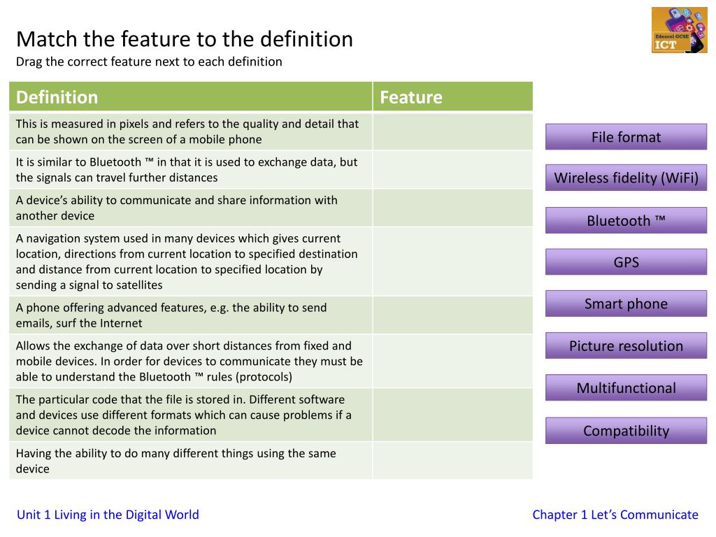 Match the feature to the definitionDrag the correct feature next to each definition File format Wireless fidelity (WiFi) Bluetooth ™ GPS Smart phone Picture resolution Multifunctional Compatibility