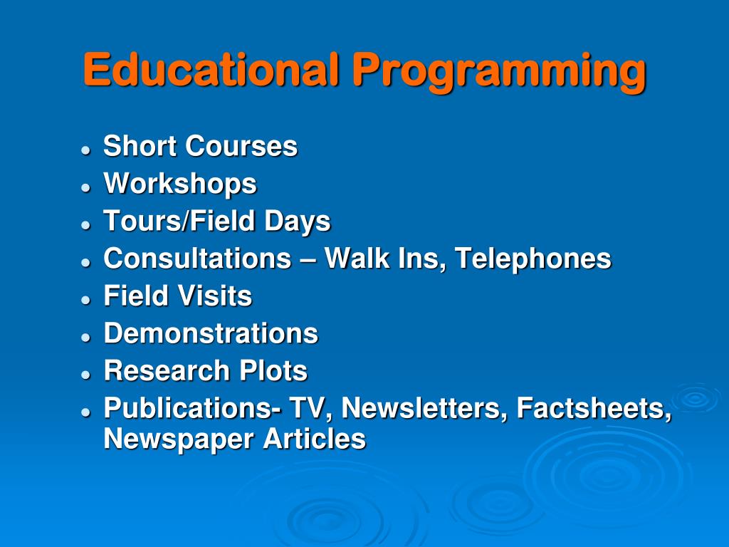 Educational Programming • Short Courses • Workshops • Tours/Field Days • Consultations – Walk Ins, Telephones • Field Visits • Demonstrations • Research Plots • Publications- TV, Newsletters, Factsheets, Newspaper Articles