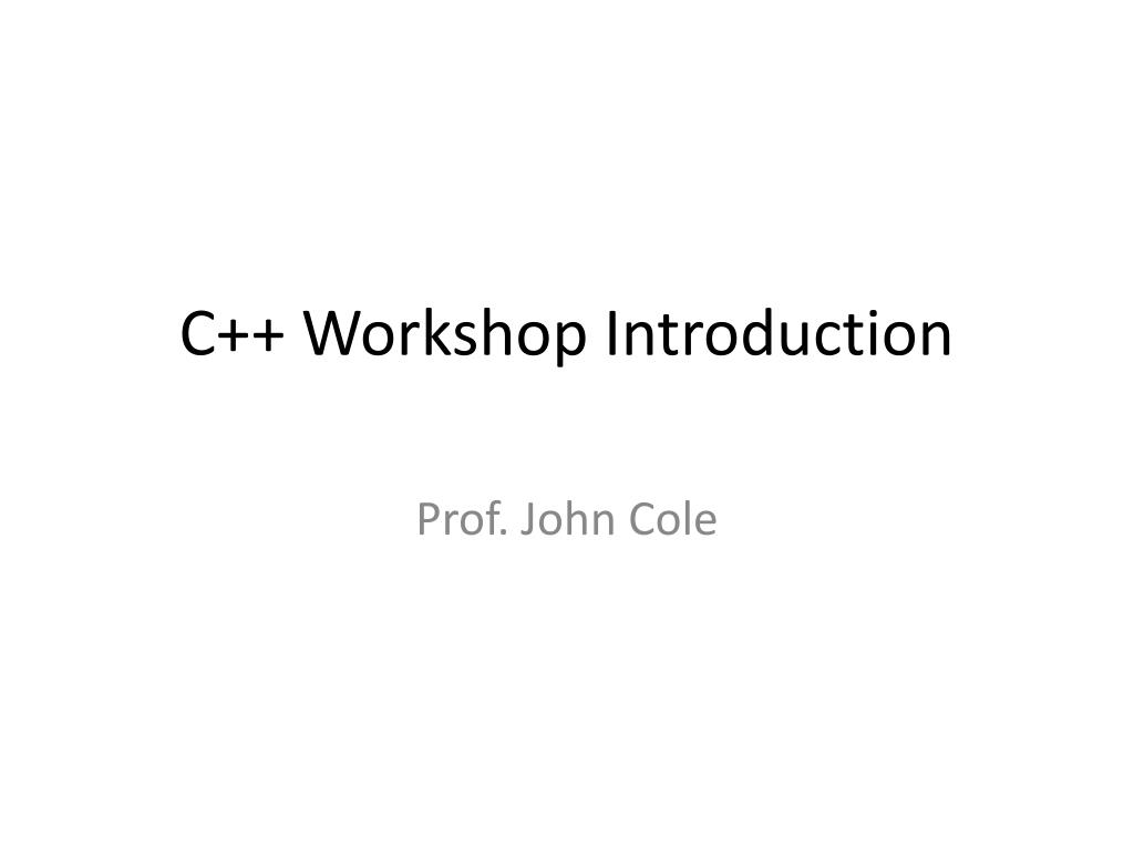 C++ Workshop Introduction. Prof. John Cole. Schedule. Day 1: Setting up. Language basics. Day 2: Arrays and Pointers Day 3: Functions, Recursion, Algorithms Day 4: Real-world problems , File I/O, Debugging Day 5: Object Oriented Programming. Instructor: John Cole.