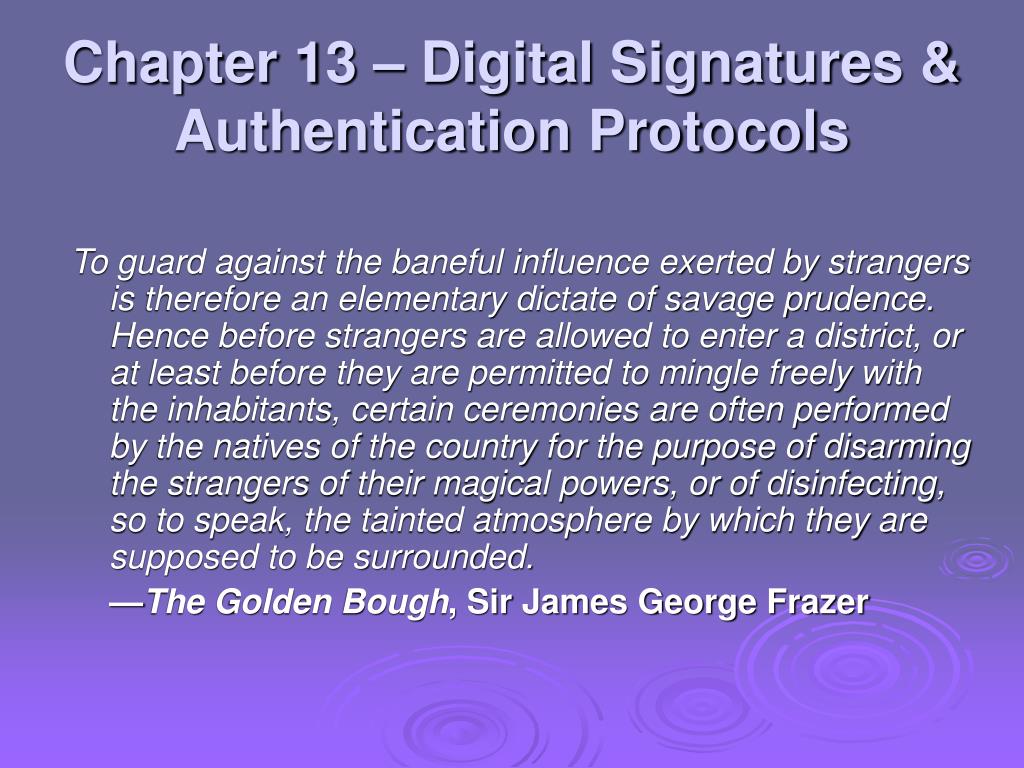 Chapter 13 – Digital Signatures & Authentication Protocols To guard against the baneful influence exerted by strangers is therefore an elementary dictate of savage prudence. Hence before strangers are allowed to enter a district, or at least before they are permitted to mingle freely with the inhabitants, certain ceremonies are often performed by the natives of the country for the purpose of disarming the strangers of their magical powers, or of disinfecting, so to speak, the tainted atmosphere by which they are supposed to be surrounded. —The Golden Bough, Sir James George Frazer