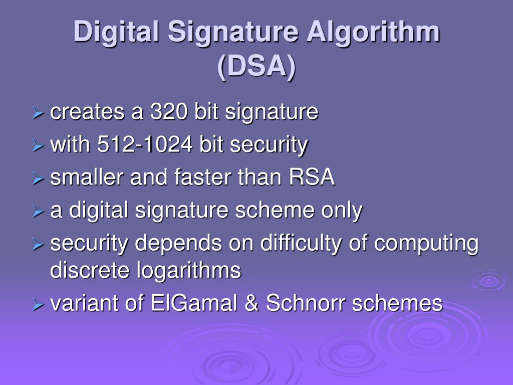 Digital Signature Algorithm (DSA) • creates a 320 bit signature • with 512-1024 bit security • smaller and faster than RSA • a digital signature scheme only • security depends on difficulty of computing discrete logarithms • variant of ElGamal & Schnorr schemes