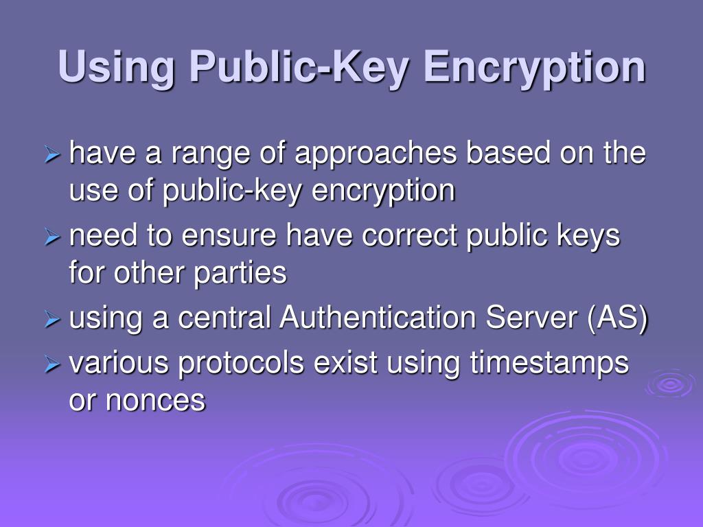 Using Public-Key Encryption • have a range of approaches based on the use of public-key encryption • need to ensure have correct public keys for other parties • using a central Authentication Server (AS) • various protocols exist using timestamps or nonces