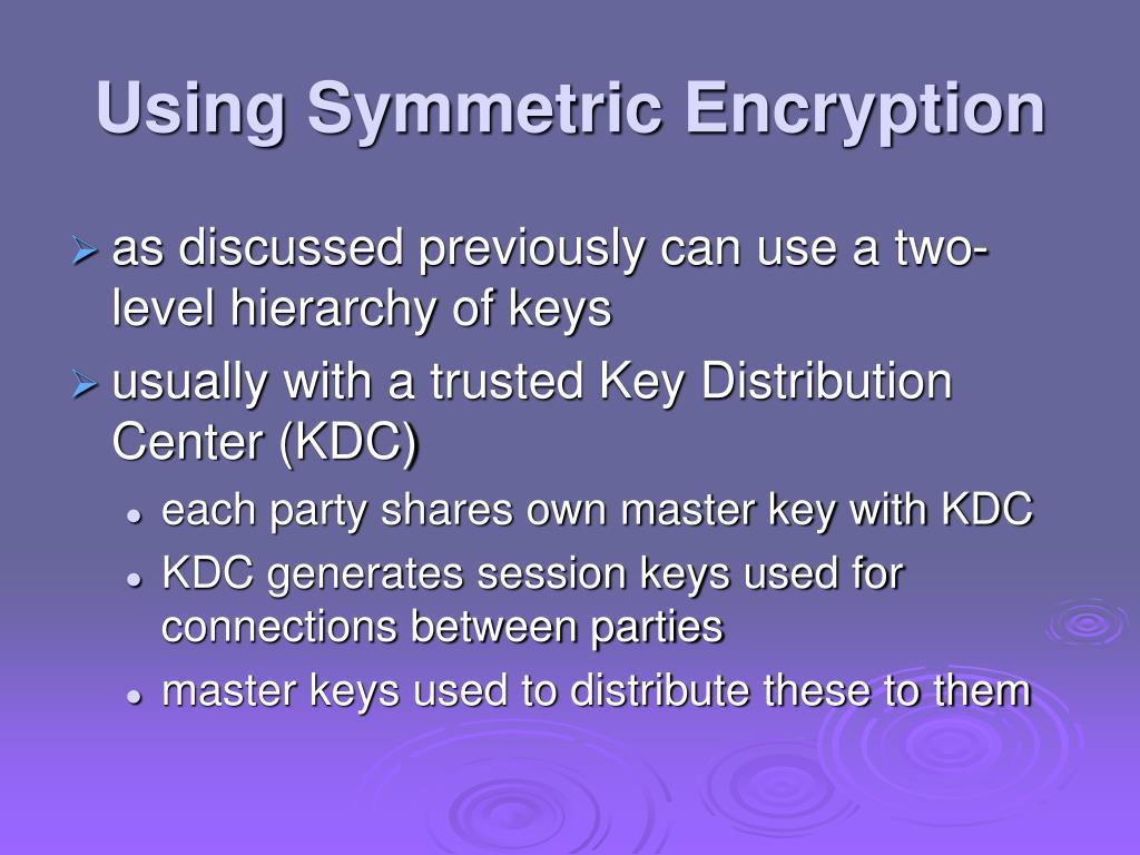 Using Symmetric Encryption • as discussed previously can use a two-level hierarchy of keys • usually with a trusted Key Distribution Center (KDC) • each party shares own master key with KDC • KDC generates session keys used for connections between parties • master keys used to distribute these to them