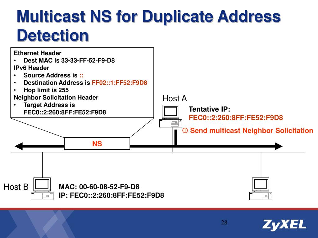 Multicast NS for Duplicate Address Detection • Ethernet Header • Dest MAC is 33-33-FF-52-F9-D8 • IPv6 Header • Source Address is :: • Destination Address is FF02::1:FF52:F9D8 • Hop limit is 255 • Neighbor Solicitation Header • Target Address is FEC0::2:260:8FF:FE52:F9D8 Host A Tentative IP: FEC0::2:260:8FF:FE52:F9D8 Send multicast Neighbor Solicitation NS Host B MAC: 00-60-08-52-F9-D8 IP: FEC0::2:260:8FF:FE52:F9D8