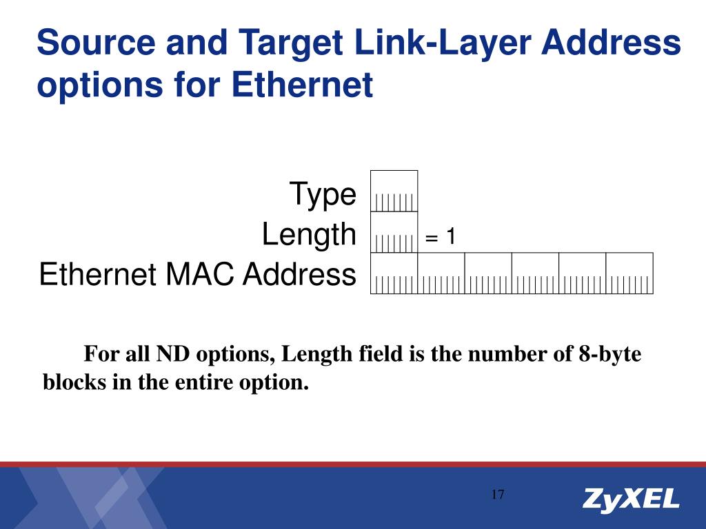 Type Length Ethernet MAC Address = 1 Source and Target Link-Layer Address options for Ethernet For all ND options, Length field is the number of 8-byte blocks in the entire option.