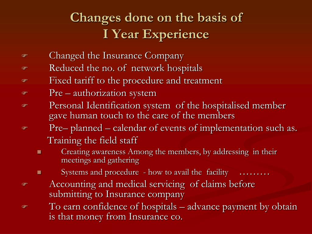 Changes done on the basis of I Year Experience • Changed the Insurance Company • Reduced the no. of network hospitals • Fixed tariff to the procedure and treatment • Pre – authorization system • Personal Identification system of the hospitalised member gave human touch to the care of the members • Pre– planned – calendar of events of implementation such as. Training the field staff • Creating awareness Among the members, by addressing in their meetings and gathering • Systems and procedure - how to avail the facility ……… • Accounting and medical servicing of claims before submitting to Insurance company • To earn confidence of hospitals – advance payment by obtain is that money from Insurance co.