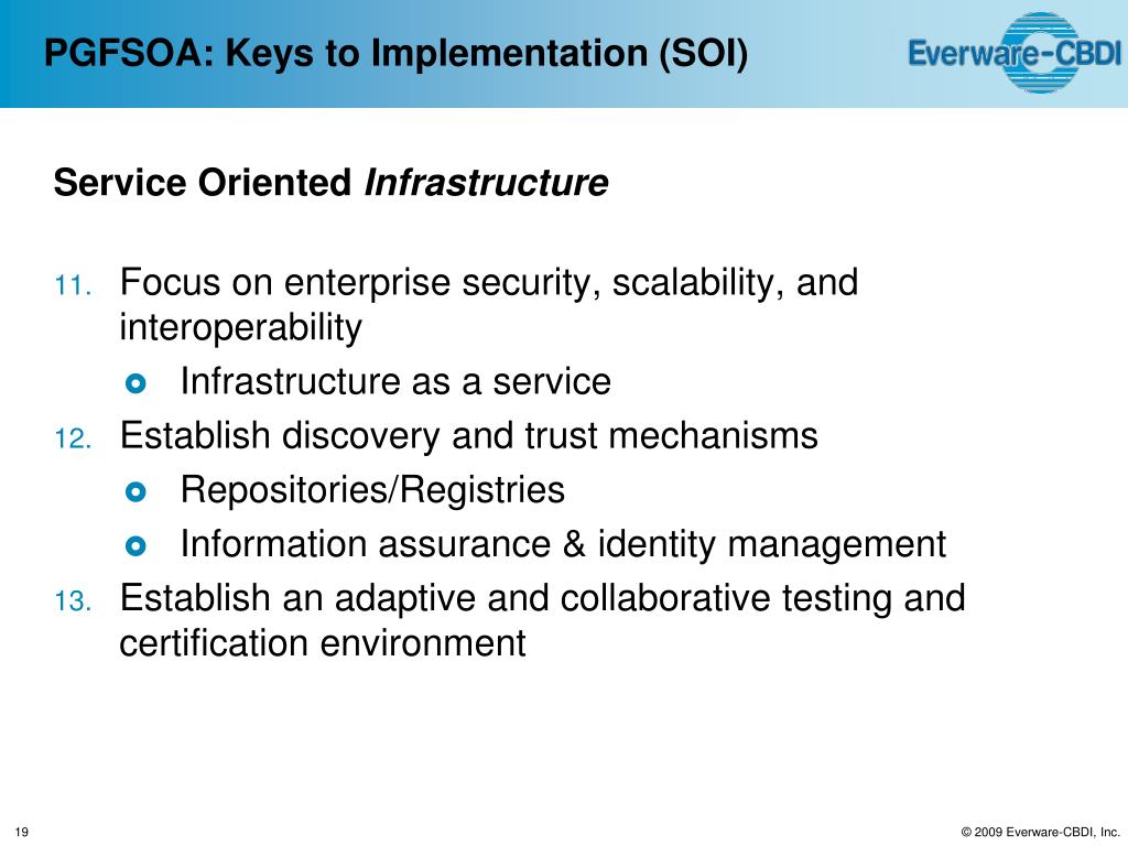 PGFSOA: Keys to Implementation (SOI) Service Oriented Infrastructure • Focus on enterprise security, scalability, and interoperability • Infrastructure as a service • Establish discovery and trust mechanisms • Repositories/Registries • Information assurance & identity management • Establish an adaptive and collaborative testing and certification environment